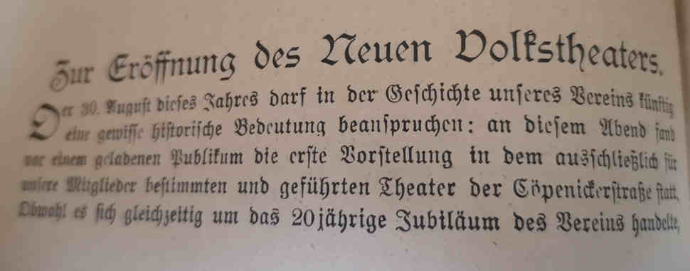 Bericht zur Eröffnung und den vorherigen Umbaumassnahmen des "Neuen Volkstheaters" in der Köpenicker Straße 68