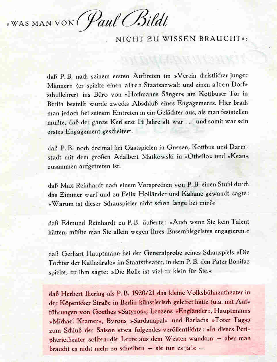 Erwähnung Paul Bildts als künstlerischer Leiter des "kleinen Volksbühnentheater" in der Köpenicker Straße 1920