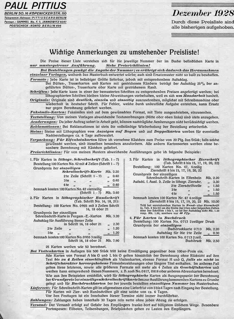 Paul Pittius, Preisliste 1928