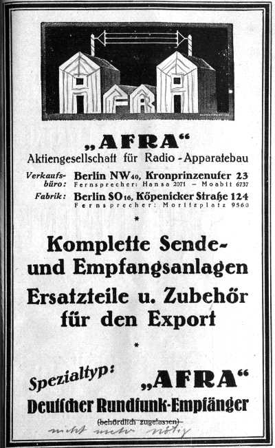 ![]() Afra Aktiengesellschaft für Radio - Apparatebau (1924) Fabrik: Berlin SO16 Köpenicker Straße 124 Verkaufsbüro Kronprinzenufer 23 |