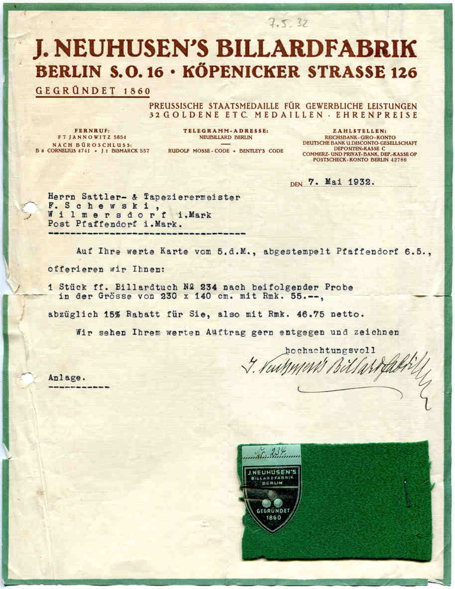 Die Billardfabrik scheint oft hin und her gezogen zu sein. So zeigt eine Rechnung 1909 die Firma in der Kommandatenstraße 77-79 und in der Beuthstraße 18-21