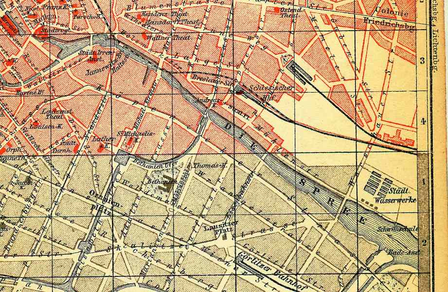 Auch dieser Stadtplan stammt von 1884, bietet uns aber mehr Informantionen zur Köpenicker Straße.