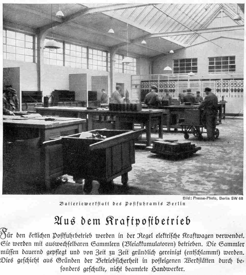 Das Bild zeigt die Werkstatt zur Aufarbeitung der Batterien im Jahr 1933.